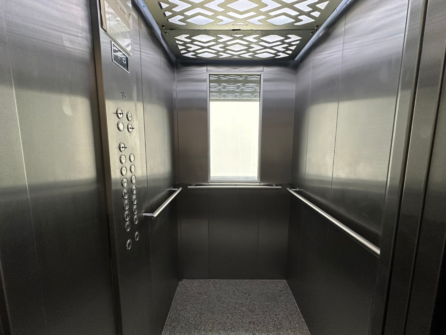 Amplio Hall con doble altura, recepción con sillones, Pantalla de seguridad, 2 ascensores, escalera de emergencia y acceso al garaje cubierto